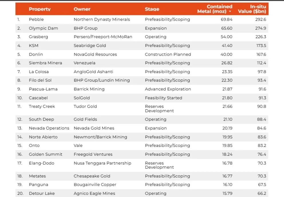 Pebble (N.º 1): Propiedad de Northern Dynasty Minerals, el proyecto ha estado estancado durante más de una década debido a su ubicación cerca de la cuenca de la Bahía de Bristol en Alaska, enfrentando una batalla legal sobre el veto de la Agencia de Protección Ambiental de EE. UU.